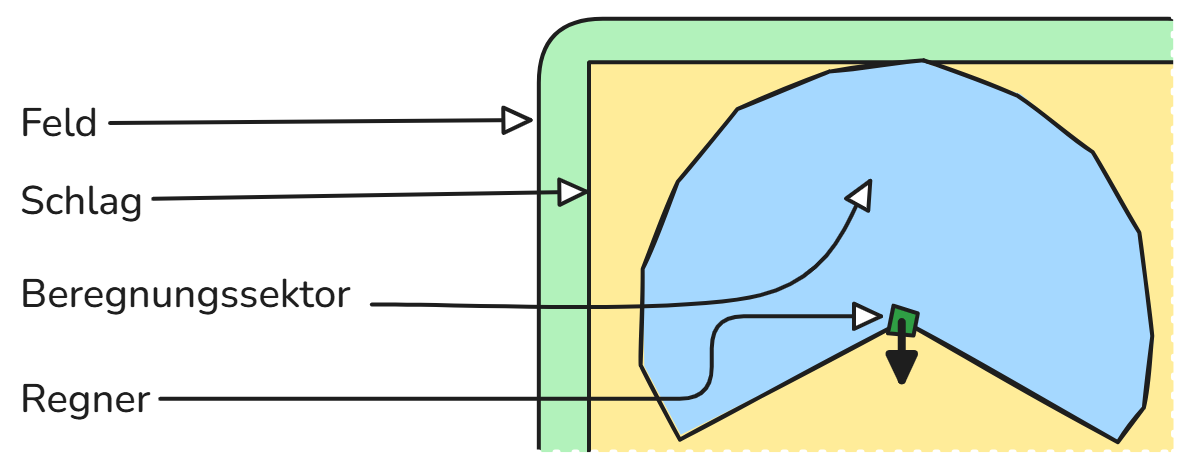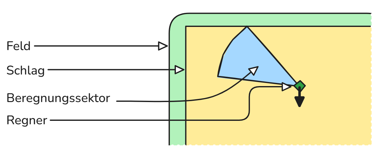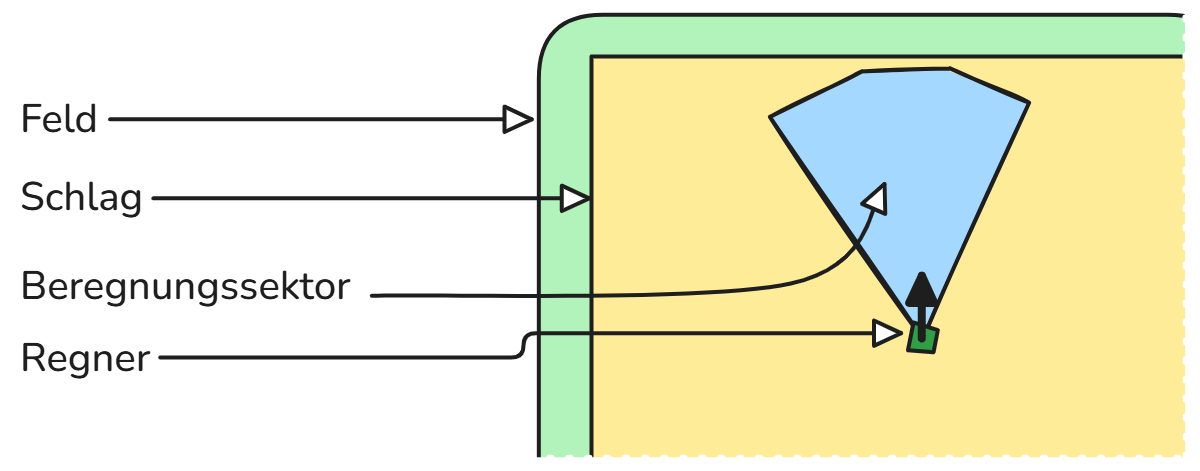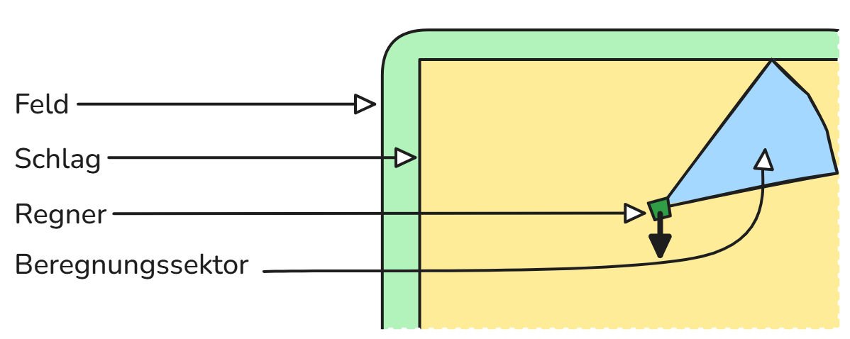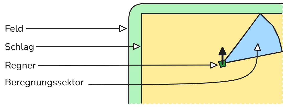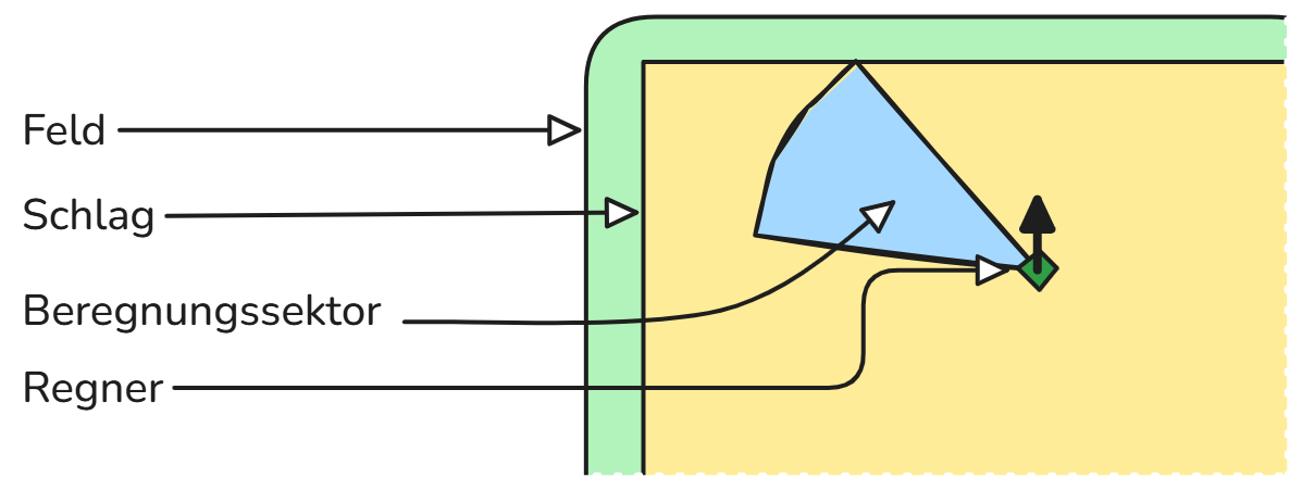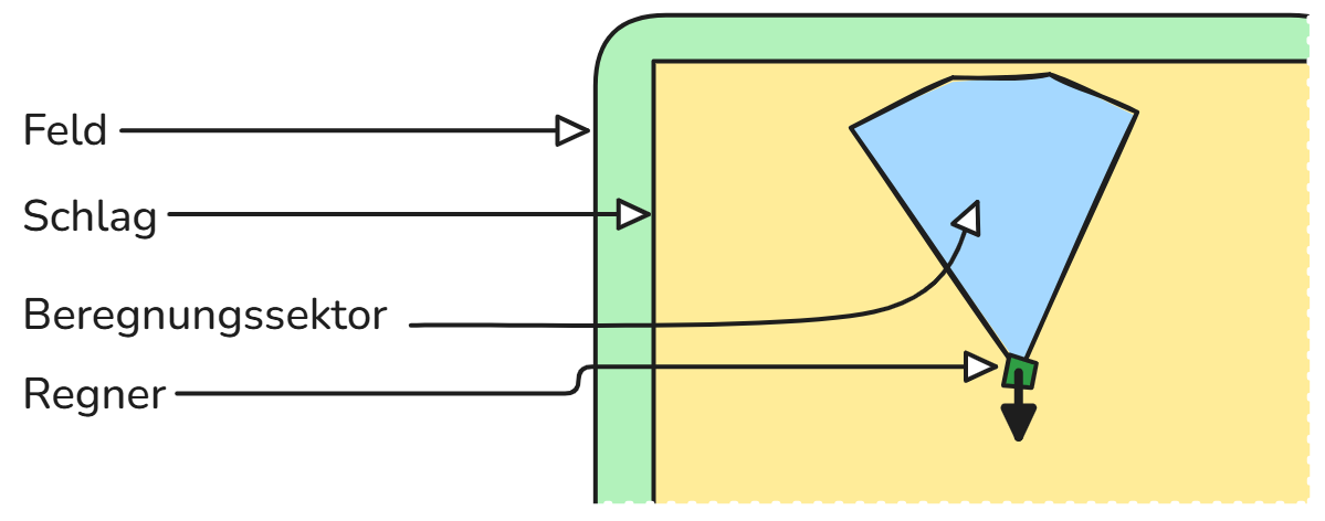 Es prüft die Abstände zur Feldkante (d und e), um die optimale Beregnung zu wählen.